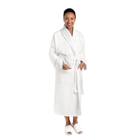 Curzon bathrobe is a medium-heavy 450g/m² white bathrobe. Available in large and extra large, with shawl collar, pockets and detachable belt. The towelling fabric makes it highly absorbent. Suitable for embroidery. Weight: 450g/m². Fabric: 100% cotton toweling. Sizes available: large and extra large. Washing instructions: Wash at 60° with reduced mechanical action. Wash dark colours separate. Do not use bleach. Do not dry clean. Medium temperature iron. Tumble dry on low heat setting.