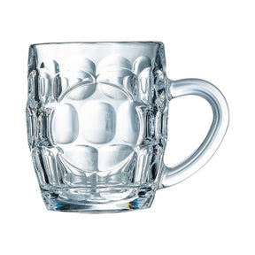 Arcoroc's Britannia tankards offer a traditional beer serve with their classic dimpled design. Ideal for bar professionals, these tankards are crafted from thick glass for ultra shock resistance. This thickness not only ensures durability but also helps maintain your beer's ideal temperature for longer. Topped off with a wide, comfortable handle for a perfect grip, these tankards are built to elevate your beer drinking experience.