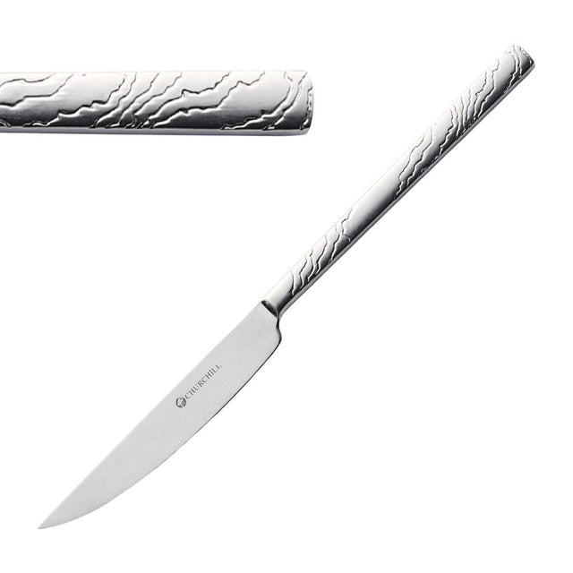 Bring a tactile touch to your table settings with this pack of twelve steak knives from Churchill's Tide Vintage collection. Crafted from high-quality 18/10 stainless steel, each knife features an embossed design with a stonewashed finish. The polished, mirrored surface adds a sophisticated touch, perfect for complementing ceramic tableware.
