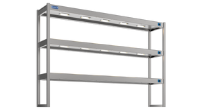 Three Tier Pass Over Gantry 1800mm is a robust over-shelving with 15 x Quartz lamp heating, Cleverly designed offering a strong fully welded stainless steel construction, each tier has a seperate dimmer switch for individual control,  Standard lengths are made to suit the NordStar Premier range of hot cupboard and are sold as a combination Hot Cupboard and Gantry