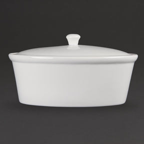 Our great value pure white porcelain oval shaped casserole dish by Olympia is fully vitrified for heat and shock resistance, the ideal crockery for hotels which want simplicity.