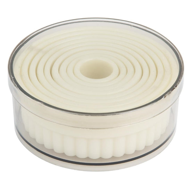 The Vogue serrated round pastry cutters offer professional precision for your baking needs. This set of nine durable nylon cutters ranges in size from 20mm to 100mm, handling everything from delicate petit fours to generously-sized scones. Their food-safe design resists stains and won't absorb odours, whilst the sharp serrated edges deliver clean cuts through even delicate pastries without crushing or dragging.