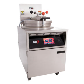 The BKI FKM-TC Pressure fryer is a powerful and effective cooking solution designed for simple operation, long life, and high product volume. The results from pressure-frying are delicious - as pressure builds up in the vat, moisture in the protein is trapped, resulting in perfectly tender and moist meat that retains a crispy exterior. The pressure fryer's heating elements are completely submerged in oil inside the vat to maximize efficiency and speed recovery times. Plus, the cold zone in the vat collects breading fall-off to keep oil fresh, while the built-in filtration system extends oil life to save you money and produce consistent results. This innovative pressure fryer features advanced touch screen controls, making operation even easier. Any operation required can be completed via the touchscreen pad. The fryer is easy to clean too, thanks to the step-by-step instructions provided by the intuitive controls.