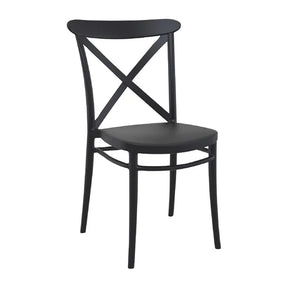 In a sleek black finish, this Cross side chair is ideally suited to hospitality, student living and workspaces. It is softly moulded for a contemporary look and comfortable feel with a supportive and sturdy polypropylene frame. The Cross side chair features a classically robust design with a supportive backrest and is stackable up to four chairs high for easy storage. Suitable for both indoor and outdoor use, the chair has been CATAS tested to contract quality, making it strong, durable and perfect for commercial use.