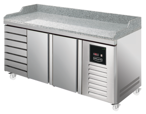 The Sterling Pro Green SPI-8-200-27 Granite Top 800mm Counter is the perfect choice for pizza professionals. The extra-deep granite worktop has plenty of space for large pizza bases and ingredients - you will have the capacity you need for busy service times. It provides 7 ambient drawers complete with food safe PVC inserts so you can safely store dough balls or pre-prepared bases. The 2 doors open up to a large refrigerated storage area for fresh ingredients and toppings.